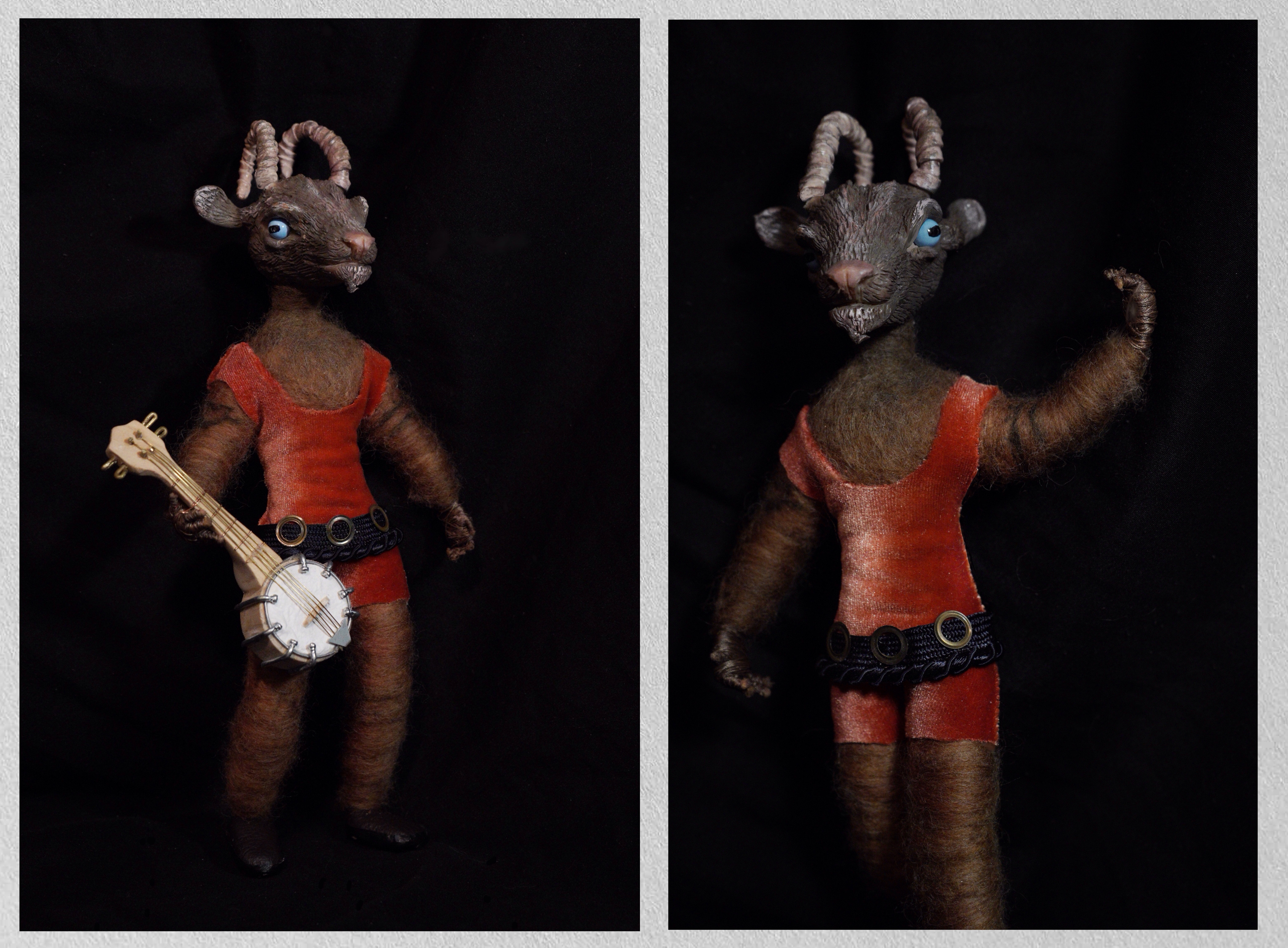 Steel wire and brass tube armature, sculpted clay head, foam core, and felted exterior.